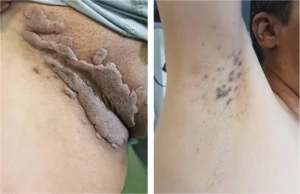 شکل ۱ — ضایعات شبیه کوندیلوماتا در کشاله ران و ضایعات شبیه لیکنپلان در زیر بغل، قبل از درمان